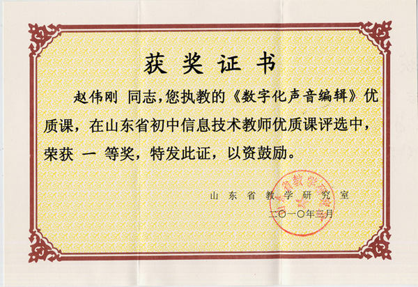 近期接省教研室通知,我校信息技术学科赵伟刚老师,去年经淄博市教研室选拔,代表学校参加山东省信息技术优质课评选,获得山东省信息技术学科优质课一等奖,这是我校近年来第二次获得信息技术学科的山东省优质课一等奖,反映了我校的信息技术教学水平,以此为平台,我们会再接再厉,争取更优异的教育教学成绩.