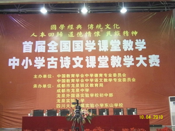 会议由中国教育学会全国中学教学专业委员会(简称“全国中语会”)主办,成都龙泉区教育局、龙泉中学、龙泉实验小学协办,大会主题词是:国学经典,传统文化,人本回归,道德情怀,民族精神。