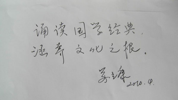 会议期间,北京教育学院教授、全国教育名家、中语会会长苏立康女士亲切会见我市代表。苏会长对我市、我校开展的“国学诵读”课题研究表示了极大的关注,就课题的研究方向给予了热情的指导和鼓励,并欣然为我校“国学诵读”活动题词:“诵读国学经典,涵养文化之根。”