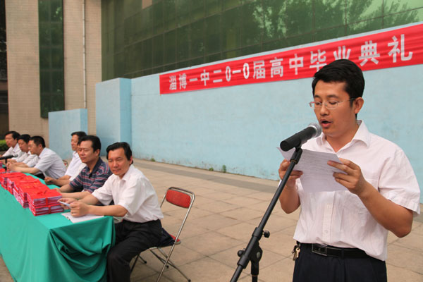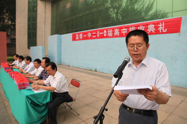典礼在庄严的《中华人民共和国国歌》声中拉开帷幕,党委书记司志宏发表了热情洋溢的致辞,随后,学生代表孙莉艳同学,家长代表——博山区石炭坞小学校长穆克通,教师代表——高2007级班主任组长贾敬貌老师先后发言。
