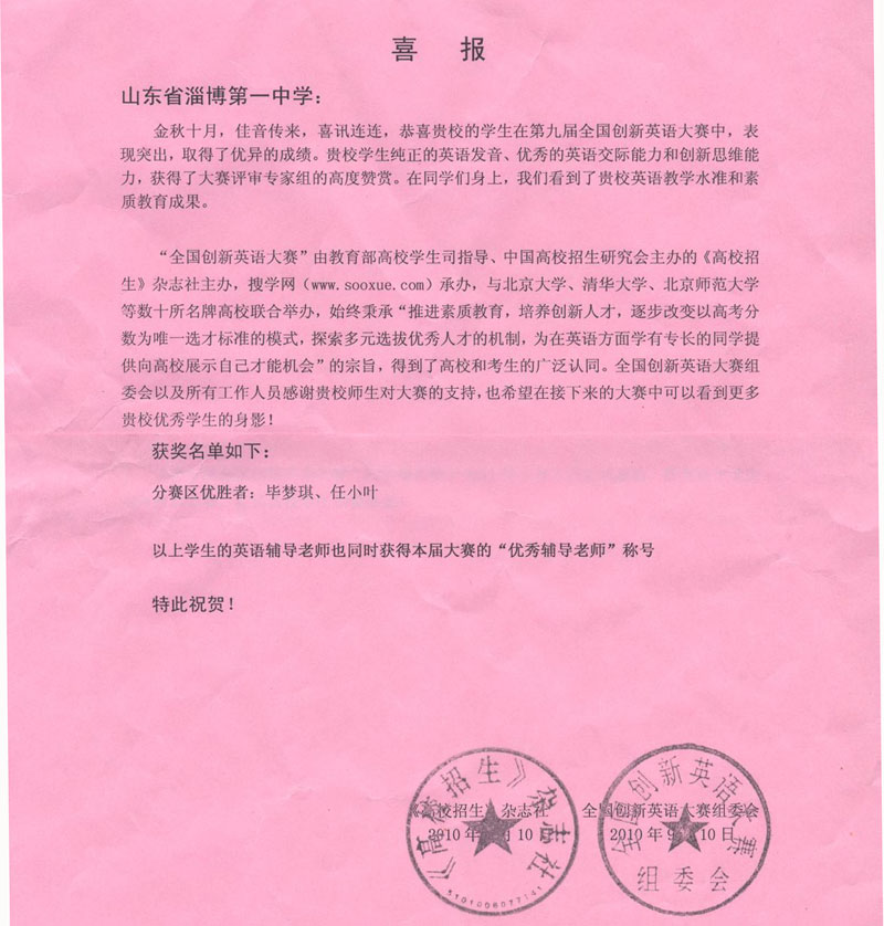 在《高校招生》杂志社主办、搜学网承办,并与国内多所知名高校联合举办的第九届全国创新英语大赛中,我校高2009级学生毕梦琪(5班)、任小叶(16班)与高二,高三选手同台竞技,通过初赛、复赛层层选拔,听力、口语、作文三项总成绩获得华北赛区三等奖,辅导老师分别为郭洪波、张爱芝。