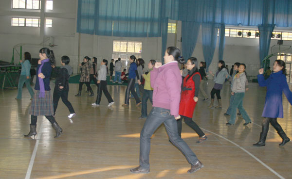 近日,课间操时间,我校体育馆传来悠美的旋律。伴着欢快的节奏,一支由30多人组成的“广场舞”队,正在翩翩起舞。