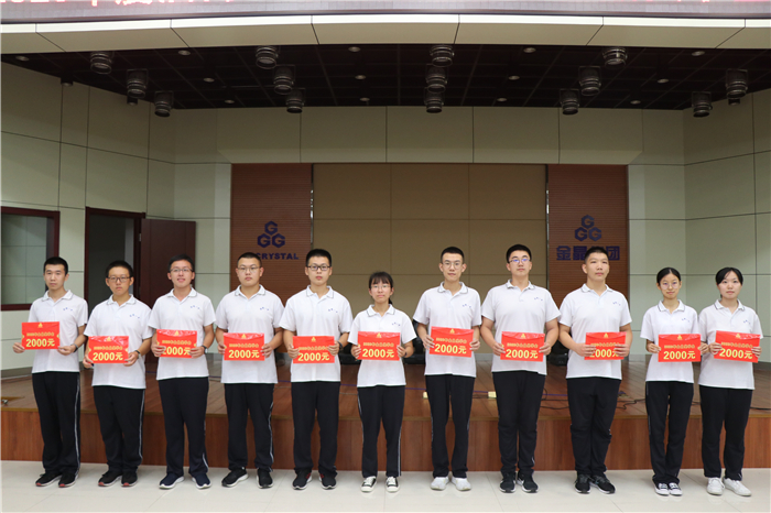 在集体观看了金晶集团企业宣传片之后,王刚董事长为获得“金晶”奖学金的11名学生逐一颁奖。他们是:张玉莹(清华大学)、丁墨晗(清华大学)、孙钰淇(北京大学)、吕浩泽(北京大学)、翟天翊(清华大学)、张宁岳(上海交通大学)、刘冠乔(中国科技大学)、翟希牧(南京大学)、唐金淙(上海交通大学)、蒋学儒(上海交通大学)、杨益耀(南京大学)。