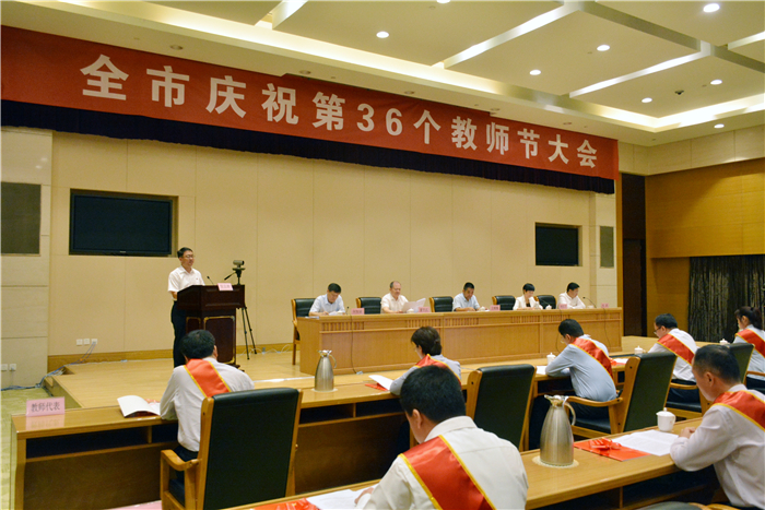 9月9日上午,全市庆祝第36个教师节大会在齐盛宾馆召开。会上,我校任春亮、李明、岳峰、赵增刚4名同志被评为淄博市优秀教师,焦念诚同志被评为淄博市优秀教育工作者,学校党委书记、校长高雪长作为学校代表在大会主会场作典型发言。学校中层以上干部、各教研室(中心)主任在我校分会场观看了大会直播。