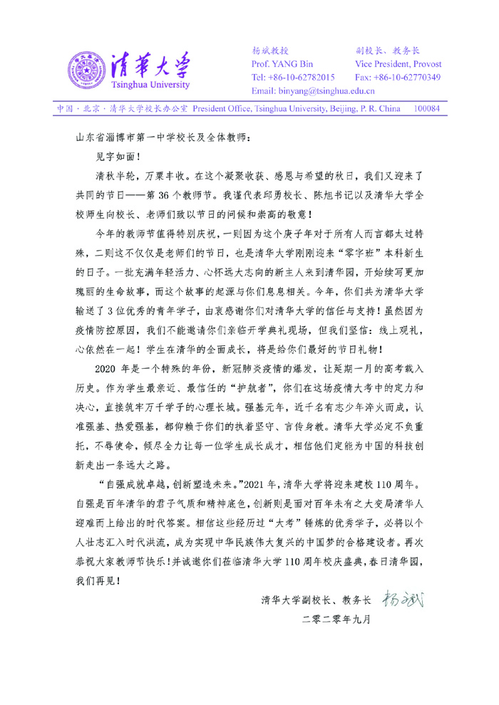 9月10日,在第36个教师节之际,清华大学向我校发来贺信,感谢学校为清华大学输送张玉莹、丁墨晗、翟天翊3位优秀毕业生,也为全体教职工送上节日祝福。这既是对我校办学理念和教育教学成果的肯定,也激励着学校奋发作为,培养更多高素质人才,续写新的华章。