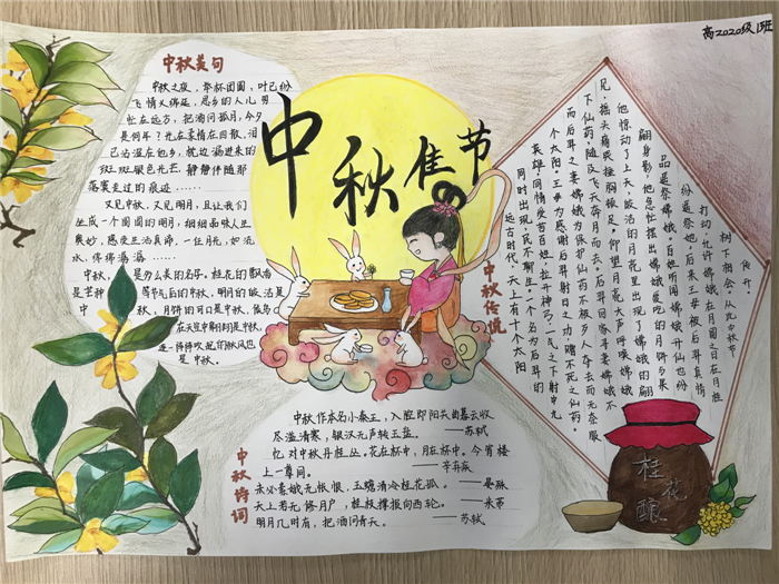 四是组织开展“喜迎中秋”手抄报比赛活动。2020级各班同学精心设计了形式多样的手抄报,用自己独特的见解画出了心目中的中秋节。通过开展“喜迎中秋”手抄报比赛,激发了同学们热爱优秀传统文化的热情,增强了民族自信心、自尊心、自豪感。