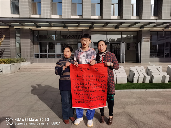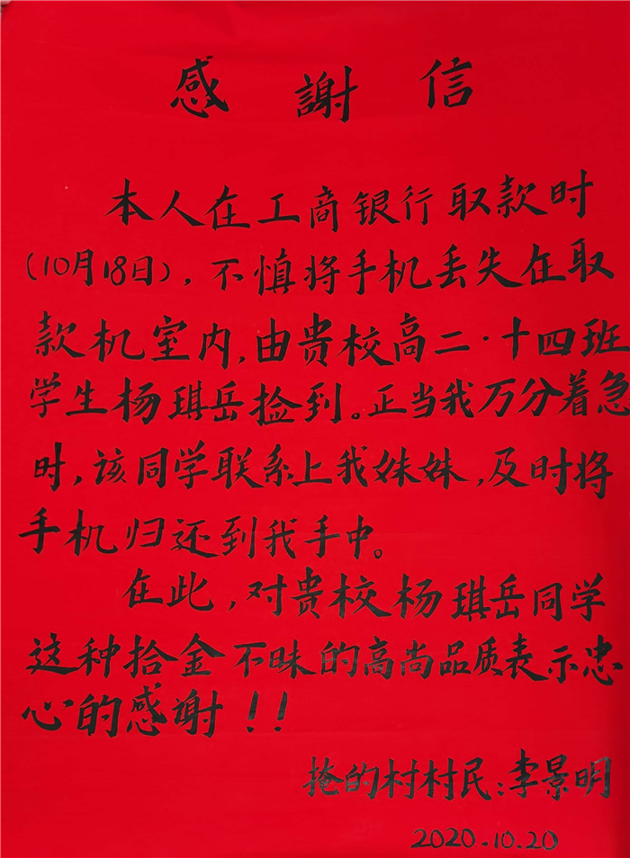 10月22日,2019级教育处收到一张写在大幅红纸上的感谢信,写信人是自博山区白塔镇掩的村村民李景明。他在感谢信中写道“本人在工商银行取款时(10月18日),不慎将手机丢失在取款机室内,由贵校高二·十四班学生杨琪岳捡到。正当我万分着急时,该同学联系上我的妹妹,及时将手机归还到我的手中。在此,对贵校杨琪岳同学这种拾金不昧的高贵品质表示忠(衷)心的感谢!!”