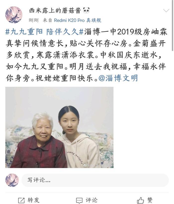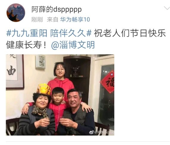 三是参与淄博文明网组织的“九九重阳 陪伴久久”网络文明传播活动。同学们在微博上晒出和长辈的合照、分享与长辈的感人故事,用孝道描绘了一道温情的风景线!