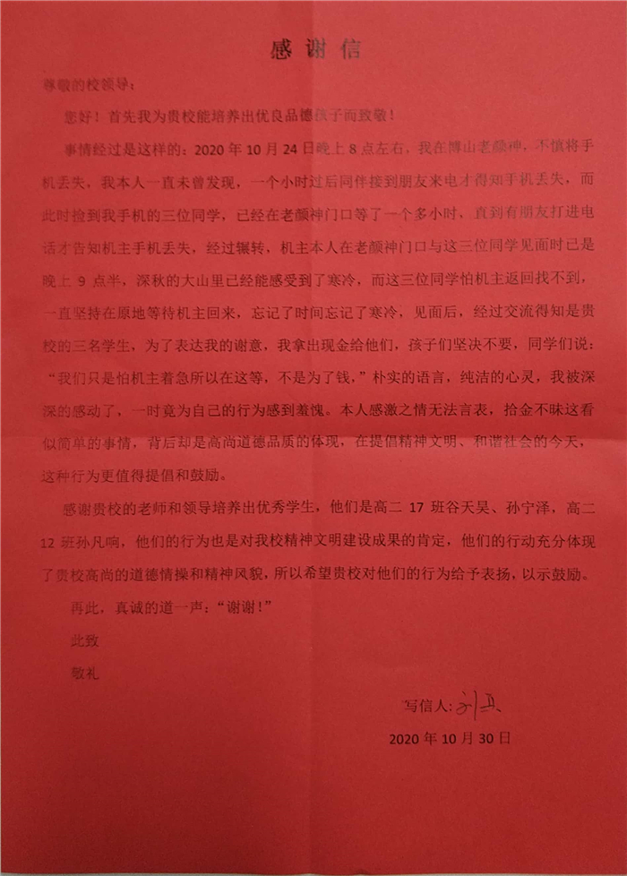 来信人是刘兵先生,他要感谢的是我年级12班孙凡响和17班谷天昊、孙宁泽3位同学。事情经过是,10月24日晚8时许,刘先生在老颜神不慎丢失手机,恰被孙凡响、谷天昊和孙宁泽3位同学捡到。同学们因为联系不上失主,又怕对方着急,就决定在原地等待失主前来寻找,这一等就是一个半小时。