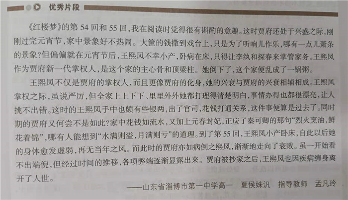 近期,我校洗凡文学社喜讯频频,收获颇丰。继4月份《作文与考试》杂志对我校洗凡文学社专版推介之后,又有5名同学在第十八届“叶圣陶杯”全国中学生新作文大赛中获奖。2019级冯若祺同学荣获全国决赛一等奖,其余四名同学荣获全国决赛二等奖。2018级杜昕冉作品《我们一起走过》发表于《漫维》杂志2021年第5期。《红楼梦》整本书阅读活动持续推进,2021级夏侯姝汎同学的研读感悟刊发于《作文通讯》2021年第6期。