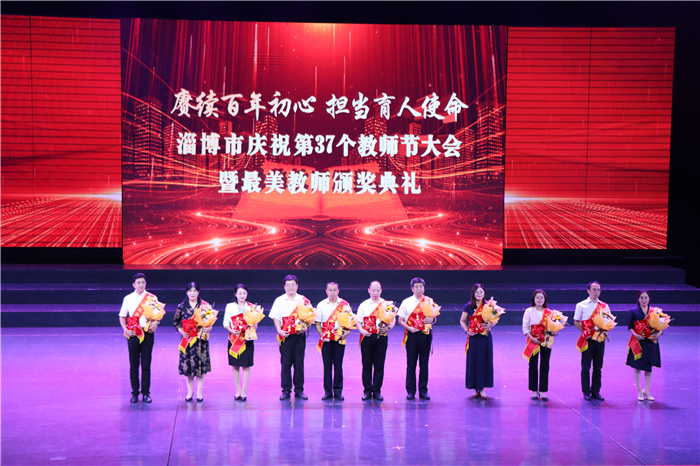 市领导巩曰锋、毕红卫、董学武等分别为“2021淄博最美教师”、省第十批特级教师颁奖,学生们为优秀老师们献花并送上诚挚祝福。