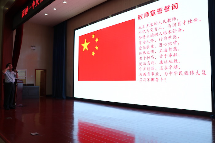会议在雄壮的国歌声中拉开帷幕。学校党委副书记李诚带领全体教职工庄严宣誓,学校党委委员、副校长胡波宣读受表彰人员名单。