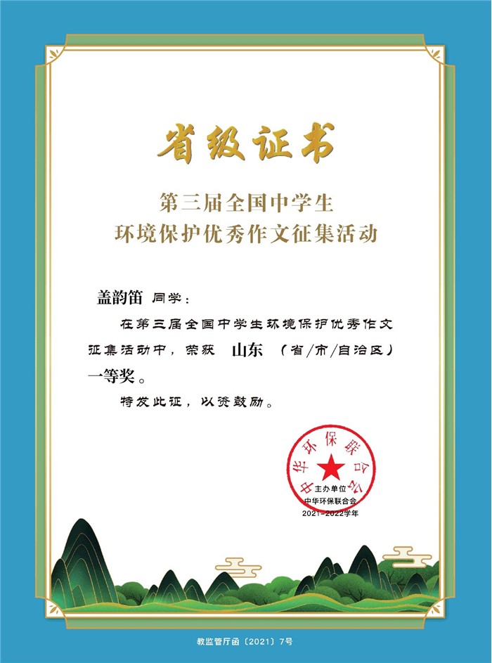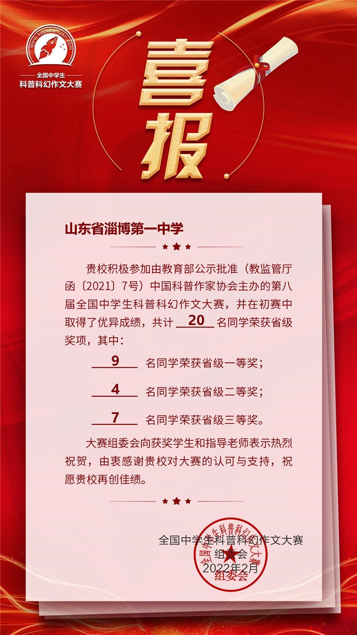 在第十九届“叶圣陶”杯全国中学生新作文大赛中,我校获省级一等奖16人,二等奖29人,三等奖40人;在全国中学生科普科幻作文大赛中,我校获省级一等奖9人,二等奖4人,三等奖7人;在全国中学生环境保护优秀作文征集活动中,我校获省级一等奖12人,二等奖39人,多名同学获三等奖。