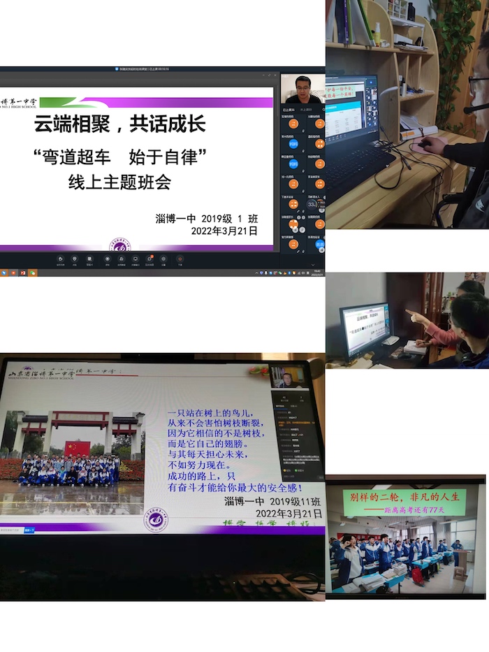 2020级班会主题为“致敬英雄,向逆行者学习;强化自律,向身边榜样学习”,各位班主任分享近期省市疫情防控中出现的感人事迹,使同学们深刻体会肩上担负的责任;总结一周来同学们的学习情况,展示部分学生的优秀学习成果,希望大家居家学习期间严格要求自己,学会自律,逆袭而上,力争做最好的自己。2019级班会主题为“弯道超车,始于自律”,班主任老师展示了前期通过问卷调查、课堂学习、钉钉打卡等方式所掌握的同学们居家学习的情况,并通过不同方式与大家分享了线上优秀学习习惯和方法,强调“信心+行动+坚持”才能取得弯道超车的机会;各班还观看了来自2021级、2020级的高考祝福视频,极大地鼓舞了斗志。