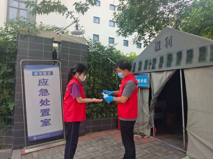 为规范做好高考疫情防控及突发事件应急处置,切实提高学校对疫情的应急处置能力,做到应急有预案、应对有良策,确保高考安全、规范、科学、平稳、顺利进行,我校6 月5日上午组织高考疫情防控应急演练活动,学生、教职工共30 余人参加。