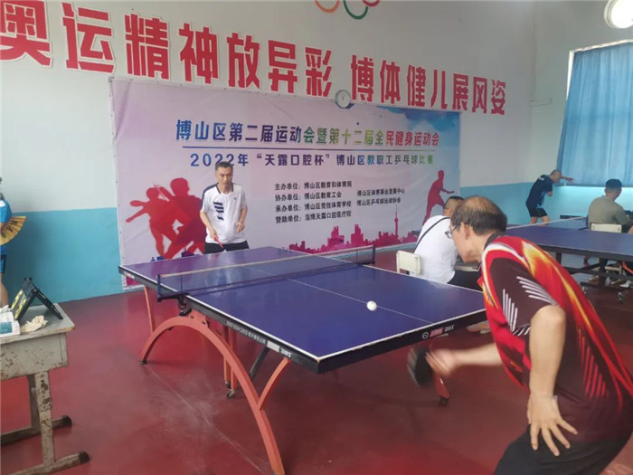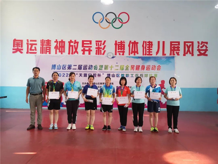 近日,博山区第二届运动会暨第十二届全民健身运动会2022年博山区教职工乒乓球比赛圆满结束,我校刘可翔、梁慎超、谢成谟、郭宁、赵叶红、逯慧组成的代表队参加比赛并获团体第一名。郭宁获女子单打第五名。