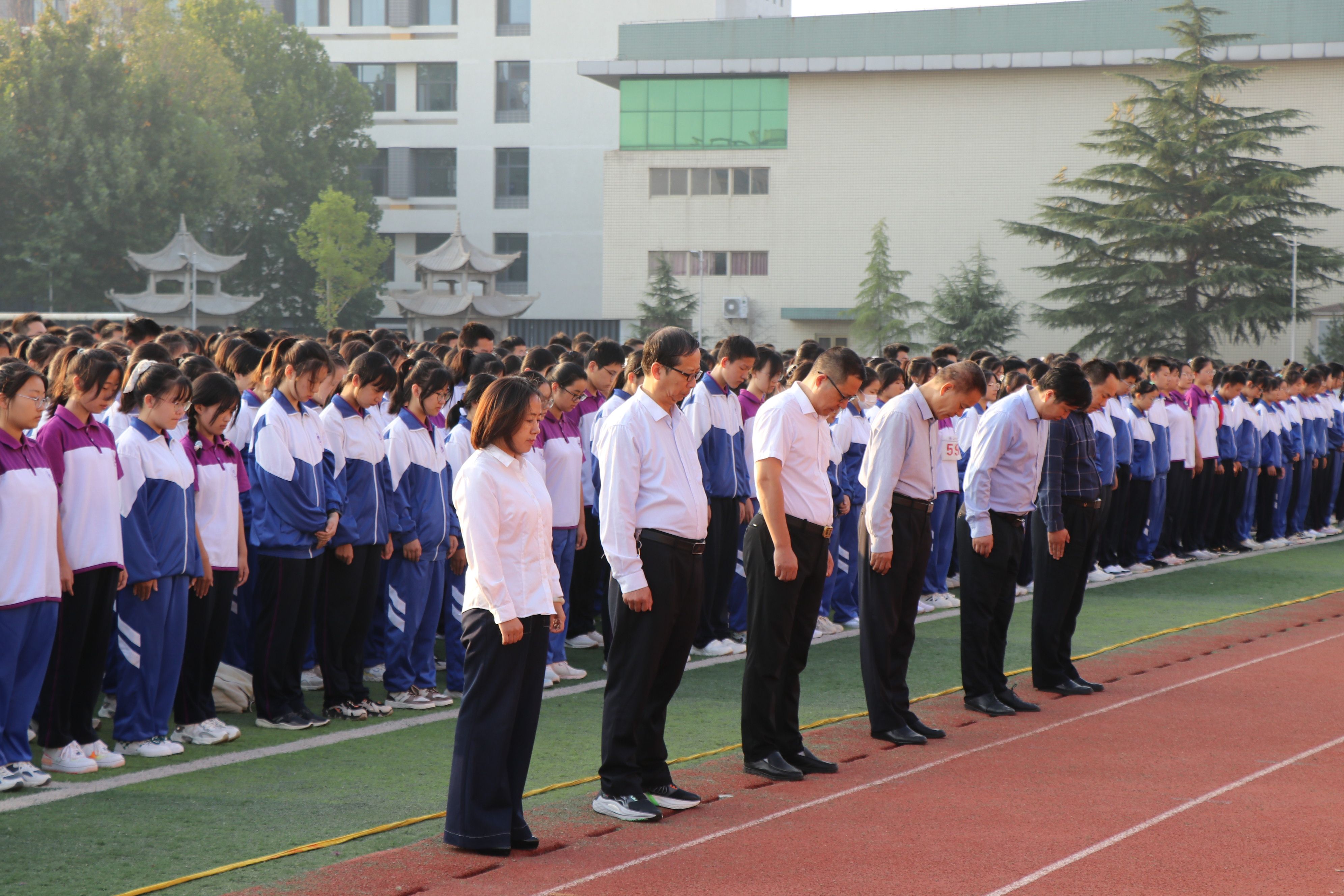 2022年9月30日是我国第9个烈士纪念日,为深切缅怀先烈的丰功伟绩,引导学生厚植爱国情怀,我校隆重举行“烈士纪念日”主题教育活动,学校领导班子、高一高二年级师生参加活动。