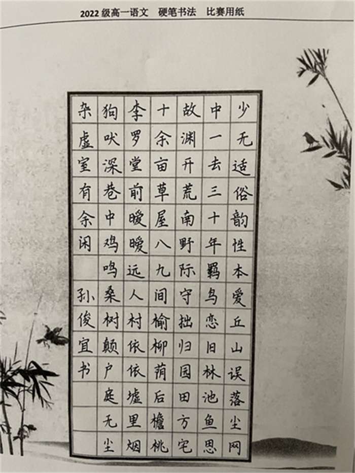 学校2022级硬笔书法比赛优秀作品展 日期:2022-11-25 来源:2022级 X 为进一步培养学生的练字兴趣,使同学们养成良好的书写习惯,我校2022级于11月21日—22日,利用晚静班时间举办硬笔书法比赛。 优秀作品展示如下: