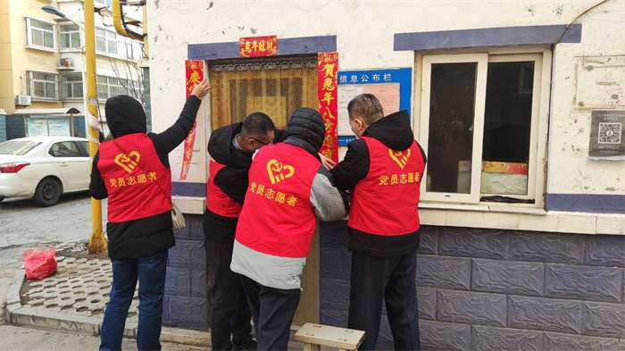 开展迎新春志愿服务。1月19日上午,行管党支部党员志愿者分成五个小组,分别前往文园、馨园进行社区服务。志愿者们不畏寒冷清洁楼栋小广告,张贴春联,装点每一个单元楼宇门,营造出浓厚的节日氛围,与社区居民们喜迎新春。