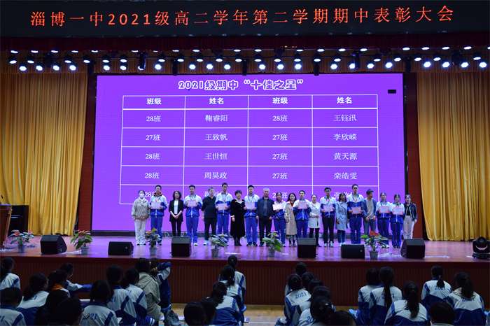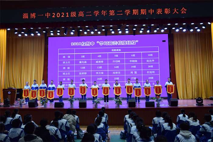 表彰大会上,年级教务处负责人宣读了期中学习质量检测集体优胜奖、个人奖项获奖名单。家长代表和教研组长等分别为获奖班级及学生颁发流动红旗和定制奖牌,并与学生合影留念。学校特别邀请“功勋校友”曲东升先生作专题报告,激励同学们奋勇争先,展现淄博一中学生风采。学校党委委员、年级负责人张奇广作《聚焦高考 未雨绸缪 挑战自我 决胜高三》主题发言,向同学们解读了强基计划招生和艺体招生最新政策,鼓励大家汲取榜样力量、科学高效的做好一轮复习,以昂扬的姿态迎接未来的挑战。