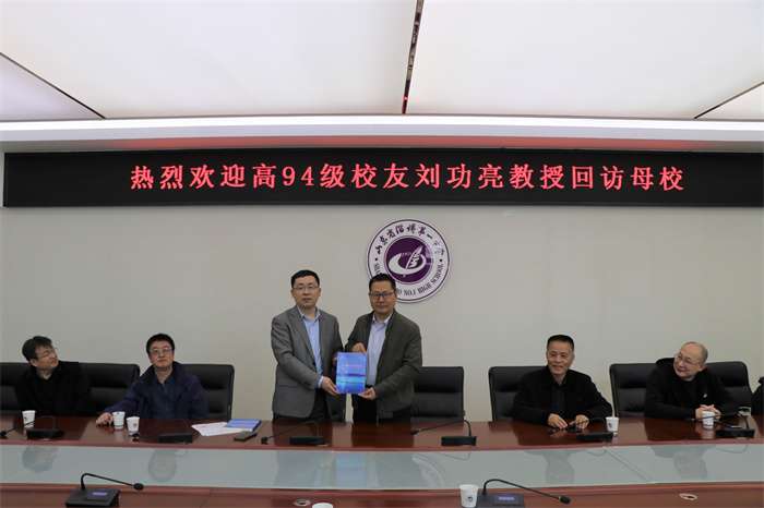 刘校长对刘功亮校友一行表示热烈欢迎,并就深化两校合作、推进创新人才培养进行了深入探讨。刘功亮校友向母校赠送个人专著和部分发明专利证书复制件。