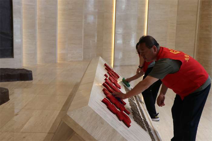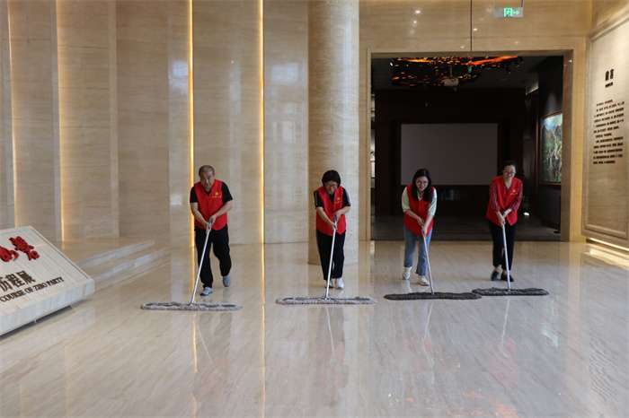 活动中,党员志愿者逐一对展厅的地面、展示柜、摆件进行了细致地清扫,清洁展厅环境。党员们一边工作,一边参观,志愿服务与红色学习教育相得益彰。