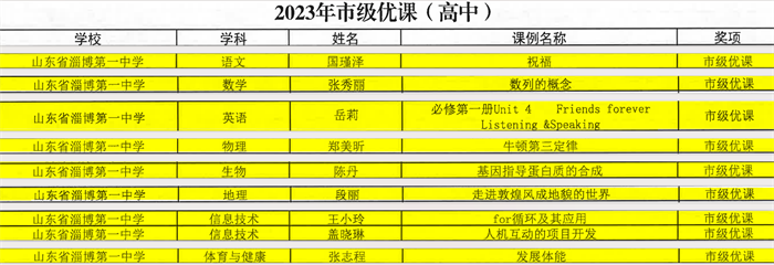 近日,《淄博市2023年“一师一优课 一课一名师”活动市级“优课”名单》发布,经教师个人创课、学校晒课、区县赛课、市级评审、全市公示等环节,我校国瑾泽、张秀丽、岳莉、郑美昕、陈丹、段丽、王小玲、盖晓琳、张志程等9名教师的课程被评为市级“优课”。