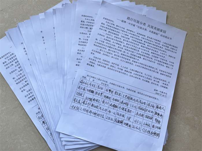 各班召开 “垃圾分类,从我做起”主题班会,从垃圾分类的意义、标准和工作要求三方面对垃圾分类知识进行了全方位的学习;组织同学们签订倡议书,号召同学们主动学习垃圾分类知识,从我做起,树立主人翁意识,共筑美丽家园;组织垃圾分类知识竞赛活动,让同学们在激烈的比赛环境中巩固了垃圾分类知识,认识到垃圾分类的重要性。
