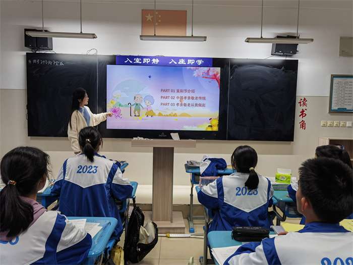 班会时间,各班主任介绍了重阳节的习俗以及孝亲敬老传统的由来,通过诵读经典诗文等方式,积极引导学生传诵中华民族优秀文化经典作品,传递“孝老爱亲传美德”的正能量。