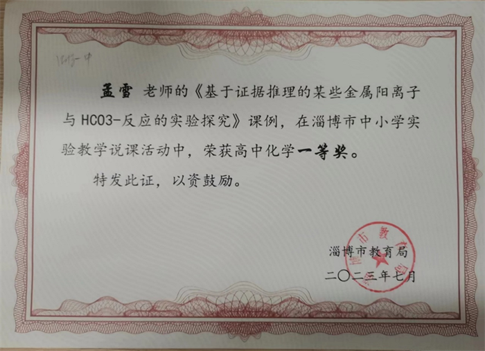 2023年淄博市中小学实验教学说课评选活动中,我校化学教研组孟雪老师荣获一等奖,并代表淄博市参加山东省中小学实验教学说课大赛。