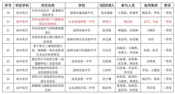 化学学科由孟雪、马泉老师指导,翟闻天、郇滨瑞两位同学设计的化学实验《某些金属阳离子与碳酸氢根反应的探究》获一等奖。