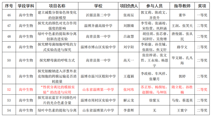 生物学科由隋立乾、孙胜楠老师指导,张珂玮、苏正彤、杨颜旭、赵颢瑞、马坤钰五位同学设计的生物实验《性状分离比的模拟实验的改进与应用》获二等奖。
