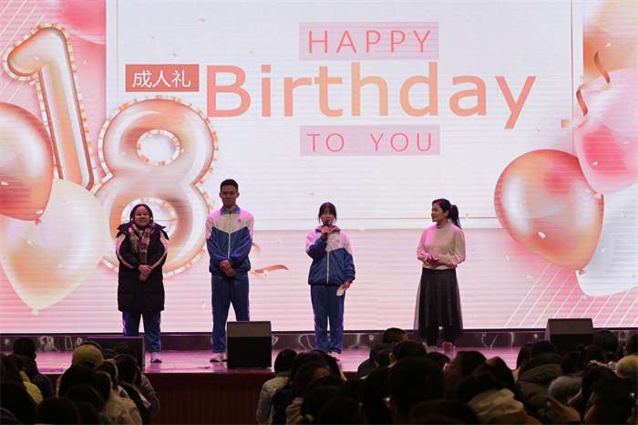 第一篇章“感悟成长 未来可期”在校本部体育馆进行。师生及家长共同观看2021级的成长视频,从第一天到一中报到至高三生活的一张张照片,勾起了大家美好的回忆;家长和老师的谆谆教导,坚定了大家应对未来挑战的信心;学生代表张子岐与大家分享了他在一中的成长进步故事;诗朗诵《我爱学习》诙谐幽默,让同学们在笑声中释放压力;28位班主任登上舞台,表达了对同学们18岁成人的祝贺和对美好未来的祝福,振奋人心而又充满深情的话语让同学们深受感动;随后,为每一位学生发放了年级特别定制的成人礼纪念徽章。惊喜互动环节,邀请3名当天过生日的同学,并抽签选取28名幸运学生上台,共同分享年级家委会为大家准备的生日蛋糕,共同庆祝大家的18岁生日。学校党委成员、年级负责人张奇广作总结发言,祝愿同学们在未来的路途上硎发新刃,淬火成钢,做青春之王,家国后浪!
