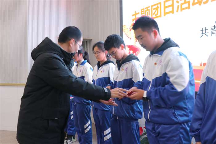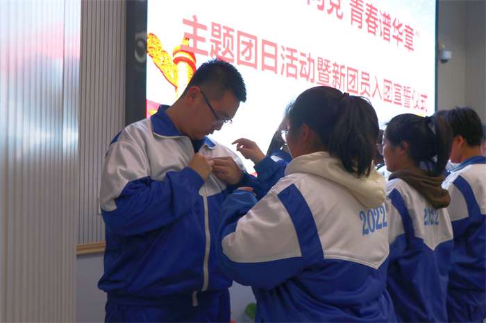学校第三党支部书记、团委书记毛洪涛及优秀团员代表为新团员颁发团章并佩戴团徽。团员代表刘赫铭带领新团员面向团旗,庄严宣誓。2022级23班李金倩同学代表新团员发言,表达了砥砺奋进的决心和志向,发出“请党放心,强国有我”的青春誓言。