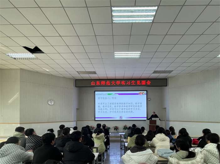 李永副主任向实习们表示热烈欢迎,并介绍了学校办学情况。山东师范大学带队教师王进发言,分享了自己的学习与职业经历,对实习学生们提出了相关要求,希望同学们服从学校安排,严格遵守实习纪律,确保安全、顺利、圆满地完成实习任务。樊恒明主任详细说明了实习的具体安排,从专业视角出发,重点阐述了如何在实习期间有效地进行备课、听课、磨课,希望实习生们抓住实习机会不断提升自我。