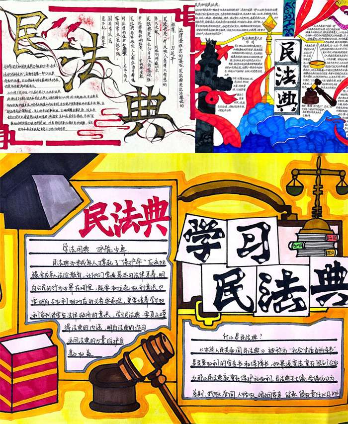 举行“民法入人心 ‘典’绘新生活”手抄报比赛。同学们根据自己的兴趣和理解,围绕民法典主题创作手抄报。手抄报内容涵盖了民法典的基本原则、重要条文等多个方面,同学们在创作过程中也深刻感受到了法律的力量和魅力。