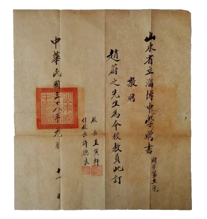 赵蔚芝先生把生命中最亮丽的年华献给了淄博一中。他渊博的学识和严谨的治学态度,不仅深刻影响着他的学生,更成为淄博一中极其宝贵的精神财富。先生是教学的名师,也是撰述的巨匠。赵蔚芝之子赵先勇校友一直有向学校捐赠自己父亲著作的愿望,尤其是山东省立淄博中学颁发给父亲的《聘书》,自己珍藏多年,在百年校庆之际,特捐赠给母校,祝贺母校百年华诞。