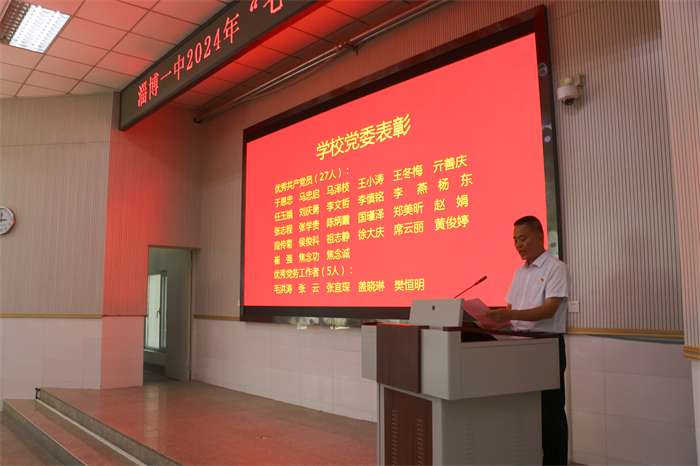 会上,党委副书记、校长王波带领全体党员重温入党誓词,在铮铮誓言中铭刻初心。党委书记刘加成为老教协党支部党员由辛基同志颁发“光荣在党50年”纪念章。吕永军通报受上级党委表彰的人员名单,宣读学校党委《关于表彰2023年度优秀共产党员、优秀党务工作者的决定》,于恩忠等27名同志为淄博一中优秀党员,毛洪涛等5名同志为淄博一中优秀党务工作者。