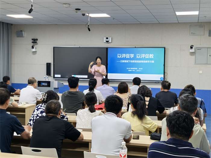 9月1日上午,我校数学学科在博雅楼精品录播室围绕“精准教学”举办学科基地建设推进会,邀请科大讯飞智学研究院吴兴芳老师做题为《以评促学,以评促教----三新视域下数智赋能精准教学》的报告。
