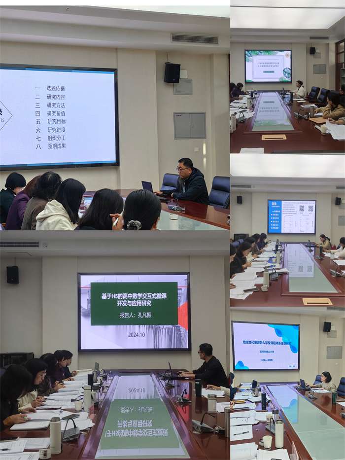 会上,学校教务处主任肖萍介绍了活动背景,宣读课题立项通知书。五位课题负责人先后做开题陈述。其中,我校蒲先磊老师主持的《指向创新思维培养的高中思政课堂探究活动设计研究》和孔凡振老师主持的《基于H5的高中数学交互式微课开发与应用研究》两项课题,凭借深入的前期调研、精准的问题定位以及紧密结合学科特点的研究设计,赢得了与会专家高度评价。来自中职、小学、幼儿园等其他学段的课题也各具特色,各主持人就研究背景、研究现状、研究目标、研究内容、研究方法、研究进度及预期成果等方面进行了全面而深入的阐述。