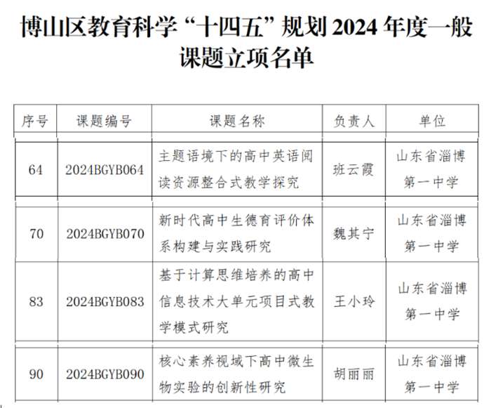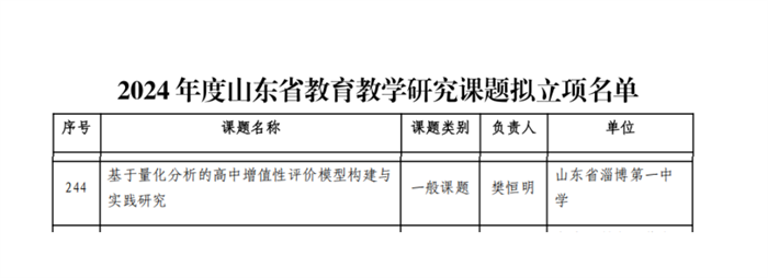 樊恒明老师主持的课题《基于量化分析的高中增值性评价模型构建与实践研究》顺利通过2024年度山东省教育教学研究课题评审,确定立项;魏其宁老师主持的《新时代高中生德育评价体系构建与实践研究》、王小玲老师主持的《基于计算思维培养的高中信息技术大单元项目式教学模式研究》、胡丽丽老师主持的《核心素养视域下高中微生物实验的创新性研究》、班云霞老师主持的《主题语境下的高中英语阅读资源整合式教学探究》四项课题顺利通过博山区教育科学“十四五”规划2024年度课题评审,确定立项。