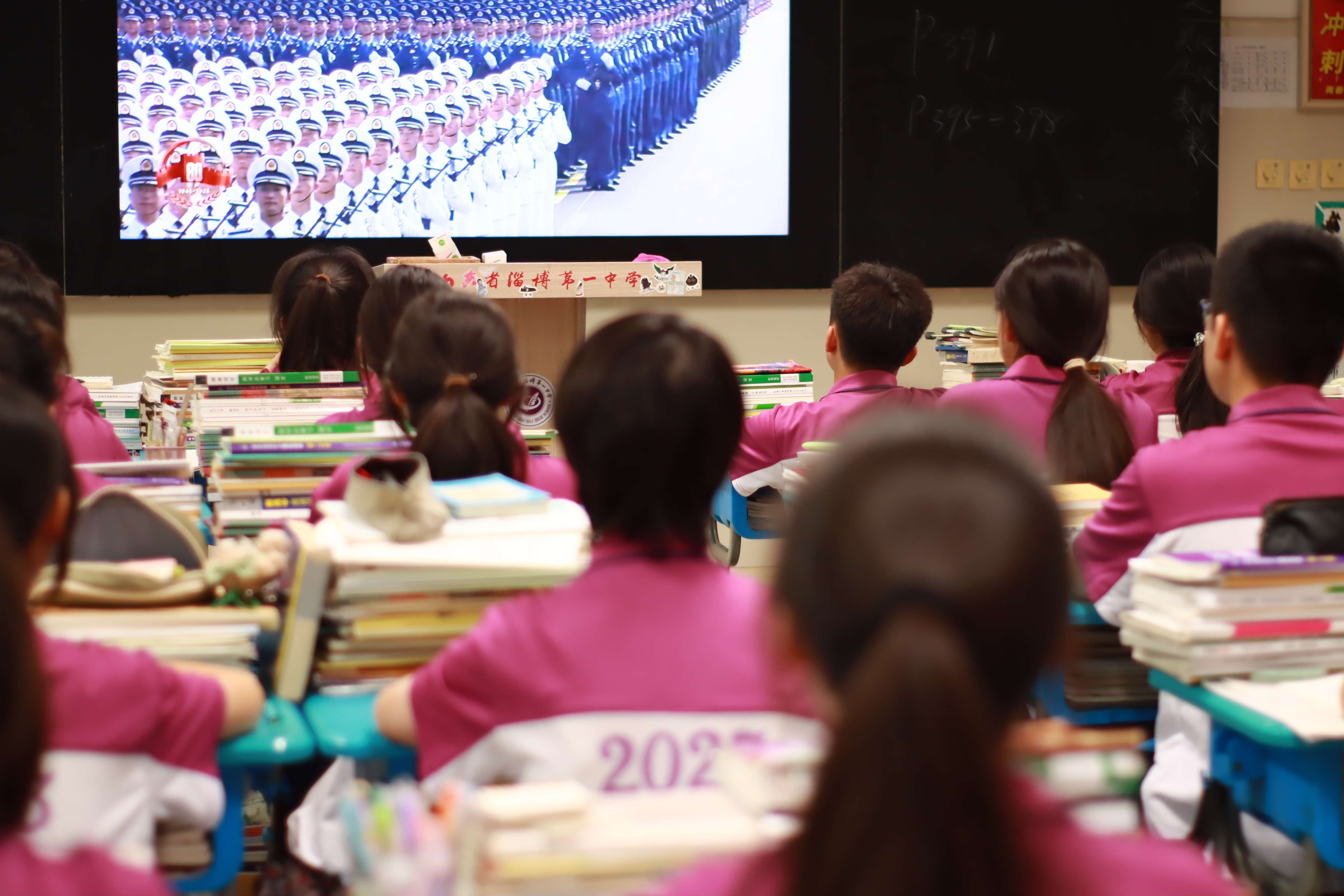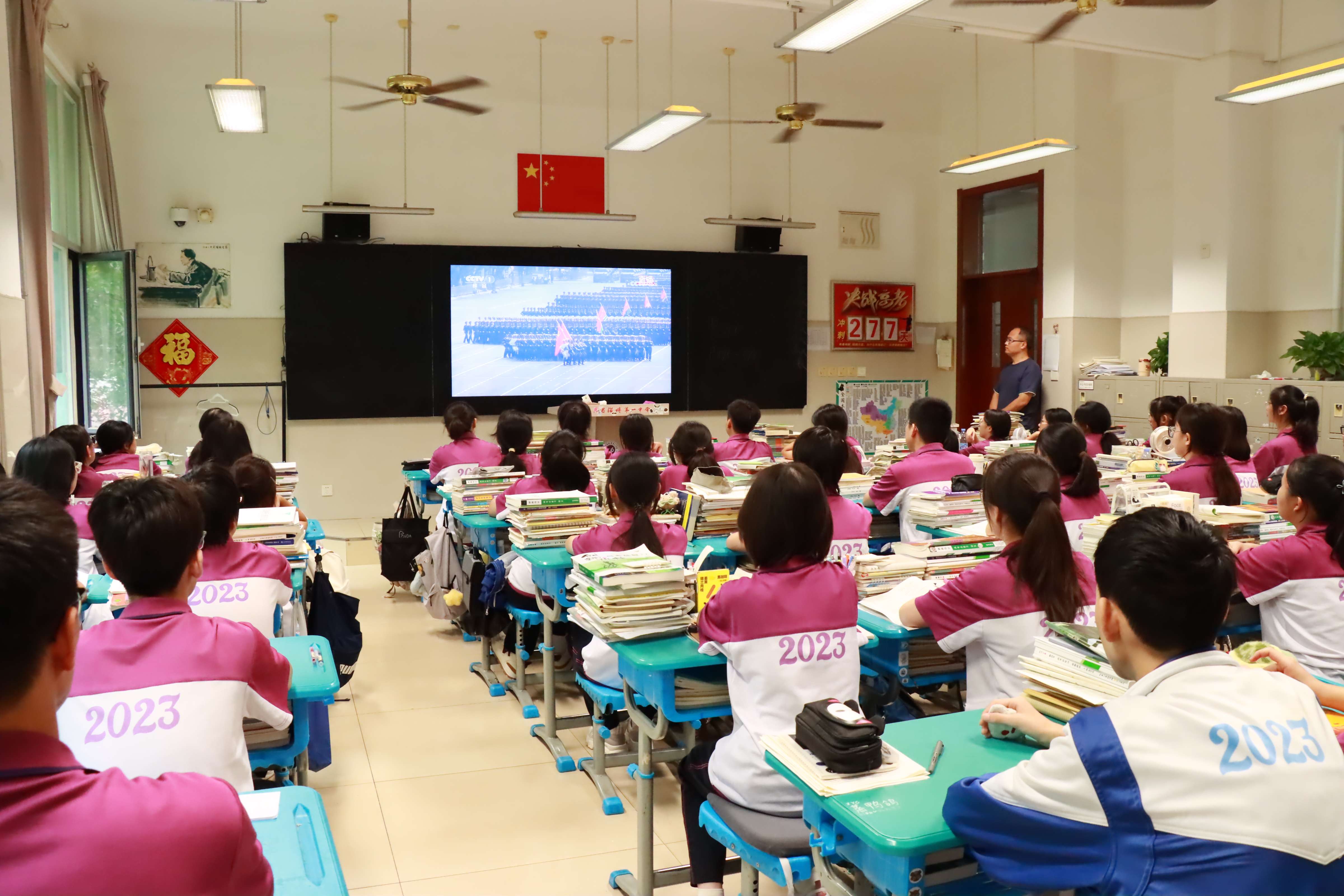 九时整,雄壮的国歌声在各班教室同时响起,全体师生肃立致敬,目光庄严而炽热。伴随着国旗仪仗队铿锵有力的步伐和战机翱翔天际的轰鸣,师生们的自豪感油然而生。镜头中,一支支受阅方队以严整的军容、昂扬的士气、精良的装备,依次通过天安门接受检阅,充分展现了新时代人民军队捍卫和平、保卫祖国的强大实力与坚定决心。现代化武器装备的震撼展示,让师生们直观感受到祖国国防力量的跨越式发展和科技强军的辉煌成就,民族自豪感与时代使命感在胸中激荡。