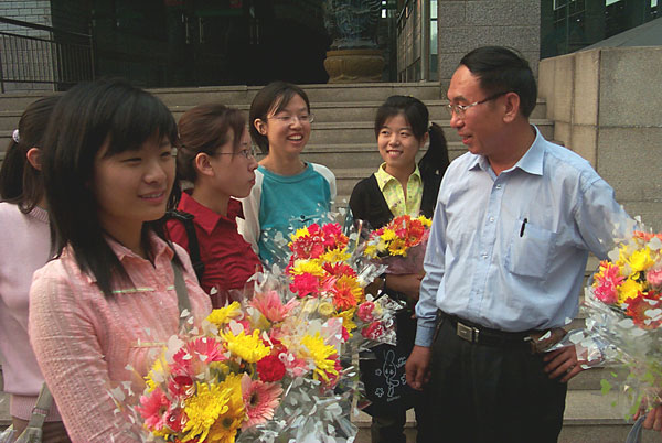 在同学们告别母校、踏上新的征程之际,陈校长代表母校衷心祝同学们的人生旅途一帆风顺。他充满深情的说,我们每个人都有三个母亲,一个是生育你的妈妈,另一个是教育你的学校,再一个是培育你的祖国。三个母亲对你是同样的期待:昨天,当你告别家乡,母亲说过:"常回家看看";今天,当你走出校门,母亲要说:"常回校看看";明天,当你飞往海外,母亲会说:"常回国看看"。