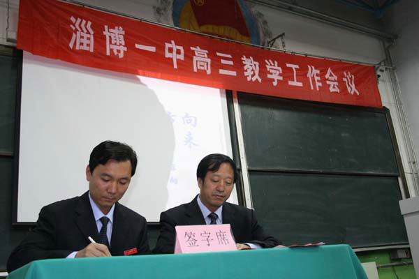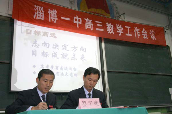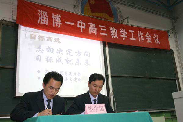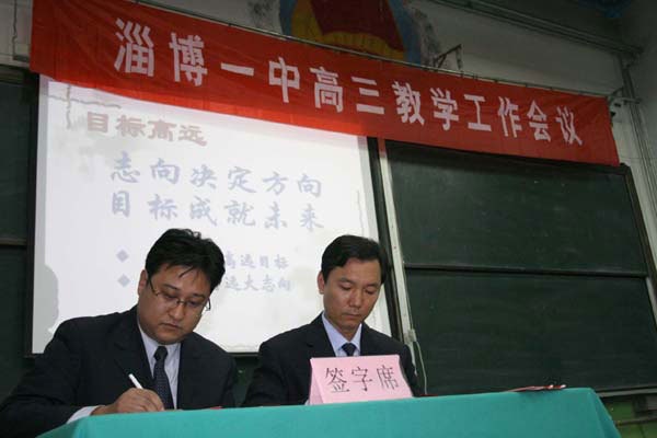 会上,陈贞凯校长与高2004级工作领导小组组长、校长助理李诚签定高考目标责任书,校长助理李诚分别与高三文科,理科,艺体第一责任人签定高考目标责任书。