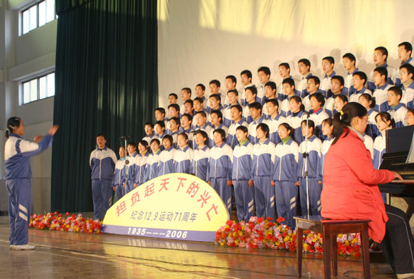 为纪念“一二·九”运动71周年,根据学校第十八届艺术节整体活动安排,12月9日,学校团委会、艺体处和高2006级领导小组组织高2006级全体学生在校本部体育馆举行了“担负起天下的兴亡”主题合唱比赛。