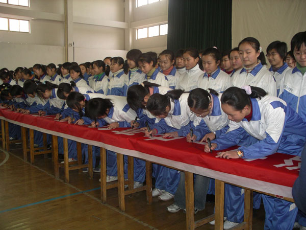 为加强学风考风建设,迎接第二次学习竞赛。12月24日,高2006级组织全体学生在学校体育馆举行了“将响亮的名字写在诚信的答卷上”签名仪式。