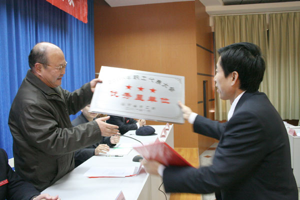 王福忠部长代表市总工会向我校颁发了“山东省2005年职工代表大会优秀星单位”奖牌和荣誉证书。赵泮利主席代表市教育工会对我校十届一次教代会的召开表示热烈祝贺,高度评价我校教代会工作制度建立最早,坚持最好,成效最大,特别是本次大会确立的构建和谐校园的主题,符合时代精神,紧扣学校实际,必将对提高教育教学质量和各项工作的协调发展起到积极的保障作用。